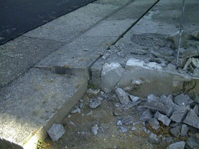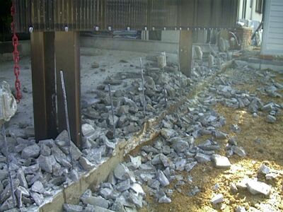 既存の駐車場との間のブロックを壊しました。ハンマーの柄が折れたり、タガネでコンクリを削っていたらハンマーで手を叩いたりとハプニング続出。鉄筋が丁寧に入れてあるのでなかなか壊せませんでした。