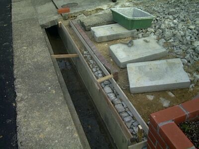 U字溝のフタの枕とレンガをモルタルで固めて作りました。前回の反省を元に余裕を持って作り直しました。