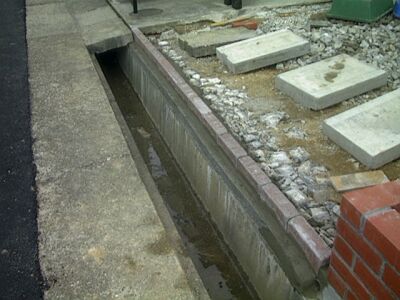 レンガを立ててモルタルの上に並べました。両側3cmくらいモルタルにレンガが埋まっています。基礎には鉄筋を入れたし、U字溝のフタとレンガの高さが同じにしてあるので多分これで大丈夫でしょう。端のほうに水抜きの穴を1ヶ所作りました。