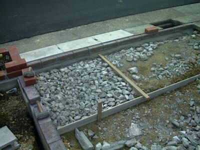 水糸で高さを出して板を立てました。この板の高さまで砂を入れればOKです。で、ブロックを砕いて敷き詰めます。砂は4cm敷く予定なので棒を渡して高さを見ながら石を敷いて行きます。作業はこうやって区切ってやるとやりやすいようですね。