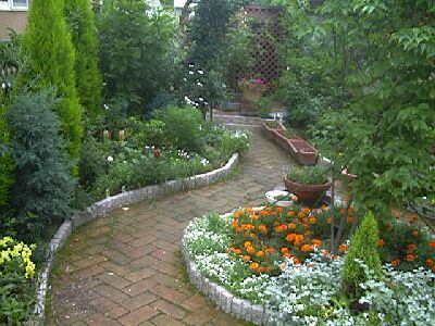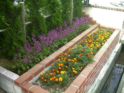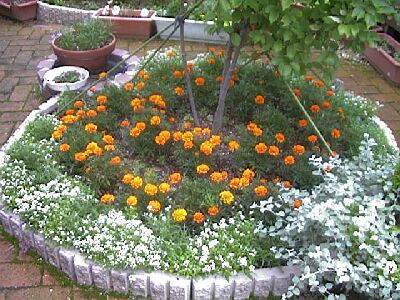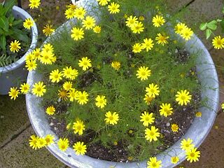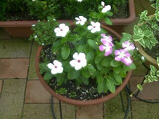 去年はここは青い花壇でイソトマが咲いていたのにね。奥に見える丸い鉢がイソトマの鉢です。 ![]() レンガテラスの鉢