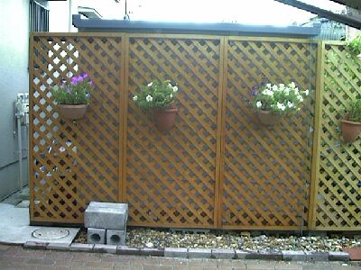 ![]() 駐車場の奥のラティスの壁にはペチュニアのハンギングです。ここは西日が当たるので良い環境ではありません。 ![]() 木のアーチ