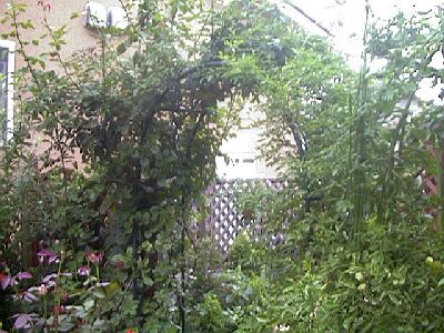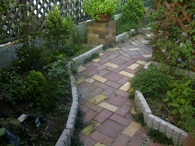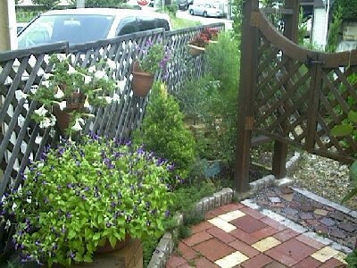 アーチの扉を開けて入るとトレニアの鉢がお出迎え。レンガは残り物をいろいろ組み合わせて敷いてあります。