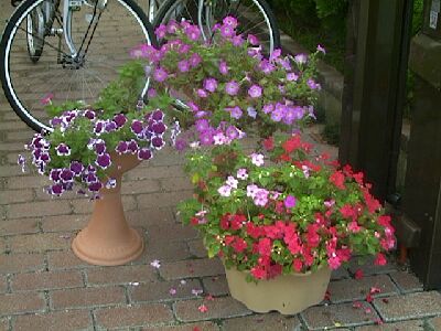 レンガの駐車場は屋根がついているのでペチュニアなど雨に弱い花によい場所です。表を通る人へのサービスも兼ねて置いてあります。