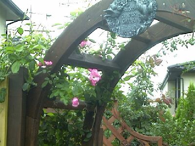 アーチのつるバラ 「アンジェラ」はずっと花が咲いています。春はすごかったけど今はこんな感じ。