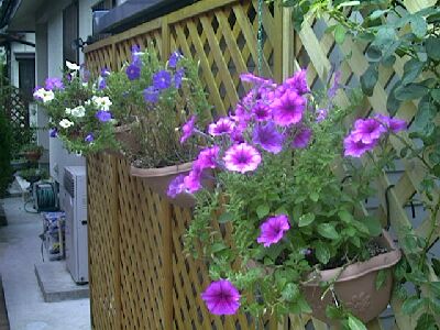 物置の裏と駐車場の間にはラティスの壁が作ってあり、ペチュニアが飾ってあります。ここは雨が当たるので最初は雨が降りそうだと移動していましたが、最近はさぼり気味。