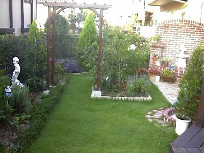 芝生がきれいでしょ。アーチがひとつ増えました。右の四角の花壇は青い花を植えています。