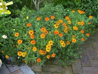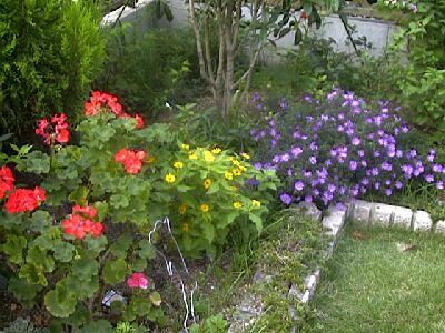 ゼラニウム、メランポジウム、宿根アスターが信号機みたいに咲いています。(^^)