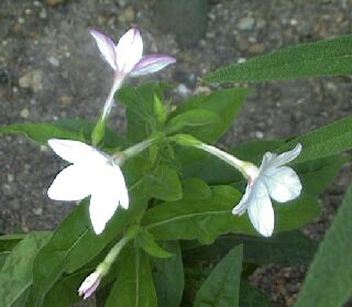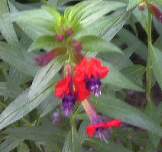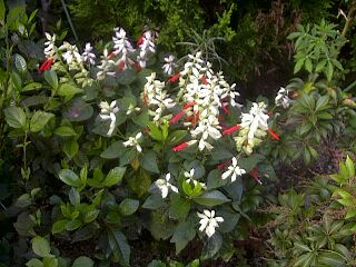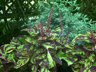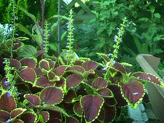 地植えのトレニアの奥のコリウスに花が咲いています。