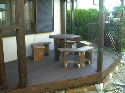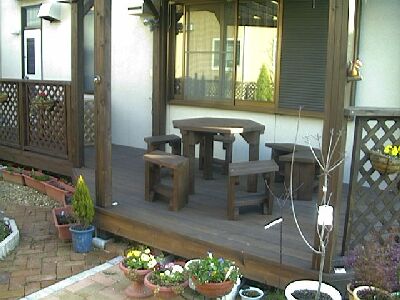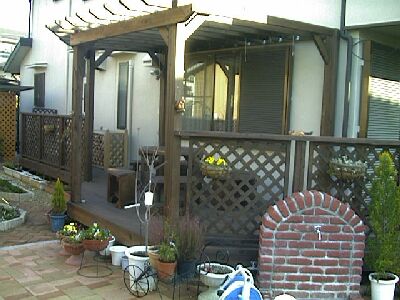 そういえば完成写真がなかったかなと。全景はカメラに入りきりませんのでパーゴラ下のメイン部分です。キシラデコールの色あせもなく落ち着いた感じです。手すりの天板は2×6なんでちょうど植木鉢を置くのに都合が良いのですが、風の強い日は注意しないと落としてしまいます。