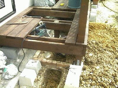 下水道の接続工事のために台所の前から雨水用の配管を分離することになり、デッキを剥がして作業してもらいました。レンガの下をトンネルを掘ってパイプを埋めていました。排水パイプが水道管に当たるので水道管を動かしたり、なかなか大変そうでした。