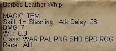 ![]() Berbed Leather WhipというNajenaでしか手に入らないMagicな鞭を買いました。 値段は仲間価格で100ppです。 貯金をはたいてしまいました。 |