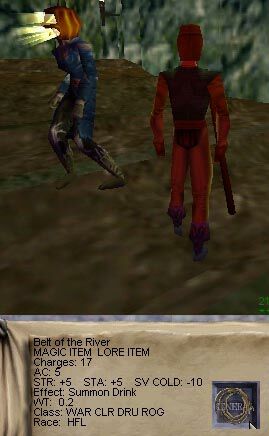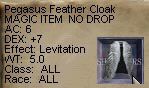 獲れたのはFeather Cloakです。ドルイドのMicklがLootしたのですが、これってグラフィックはマントのように見えるのに、肩に装備するのね。Micklの肩はWis UpなIVY Cordがあるし・・・。Levitationならドルイドは得意だし。MikuがLootすれば、普段はAC重視でCrested Spaulder装備でも、空飛ぶときだけ使えて良かったのに(泣)