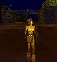 うう、後少しだ。げっ Skeltonが追ってくる。ここまで来てQeynos Hillに強制送還は嫌じゃー。SkeltonならMikuは余裕で始末できるはず。「いけなーい。裸だった。逃げよー」 前に家が・・・ おおGuardが居る。 で、Skenton君をKick! 裸でも 足癖悪いのよ 私