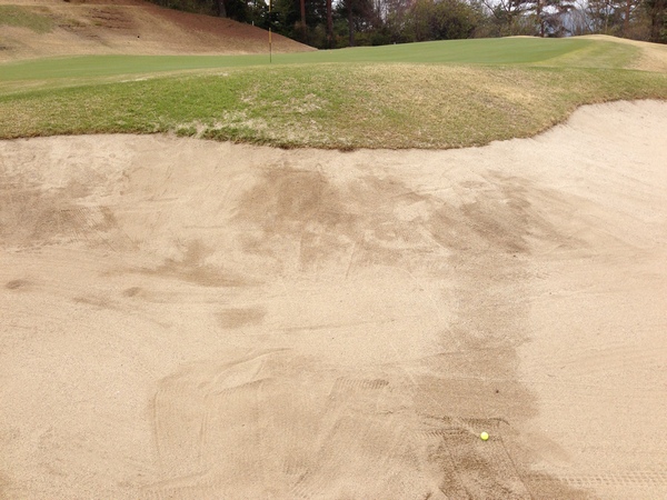 行ってみたら花道方向へ打てそう。8鉄でフォローで木の幹にシャフトぶつけながらのパンチショットで脱出。でも飛びすぎてサブグリーン前のバンカー。ここは距離が残るので入れてはいけないバンカー。AWでナイスオンしたことあるよな。でも今持ってないしカート遠いし、キャディさんは同伴者が隣へ打ち込んだのの世話で離れてるし・・・。持ってたRWで打ってみた。