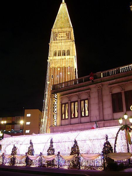 塔のイルミが遠くからでも目立ちます。前にはトンネル状のイルミネーション