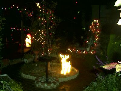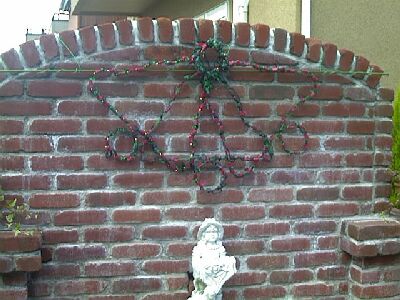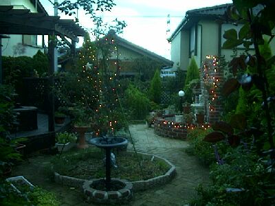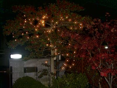 表のクロガネモチに200球つけてみました。まだ寂しいですね。でも、高いところはハシゴが短くてうまく付けられません。
