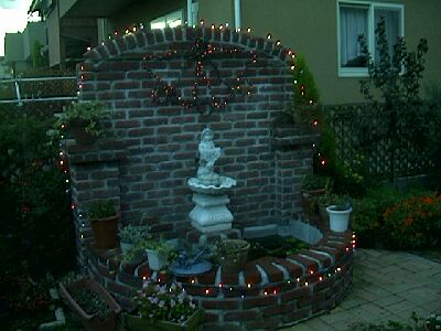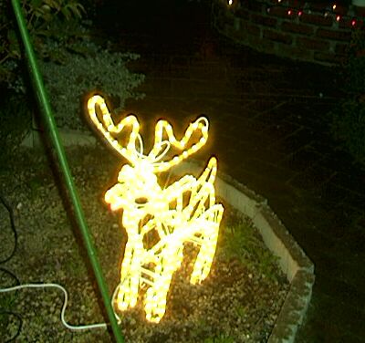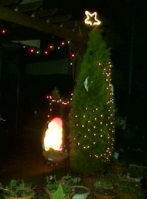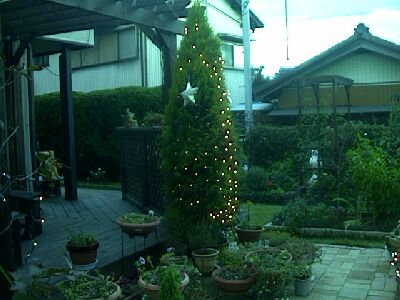 ゴールドクレストの高さ3mほどのものを庭から掘り上げて鉢植えにしました。ネットタイプの電球(200個×2枚)